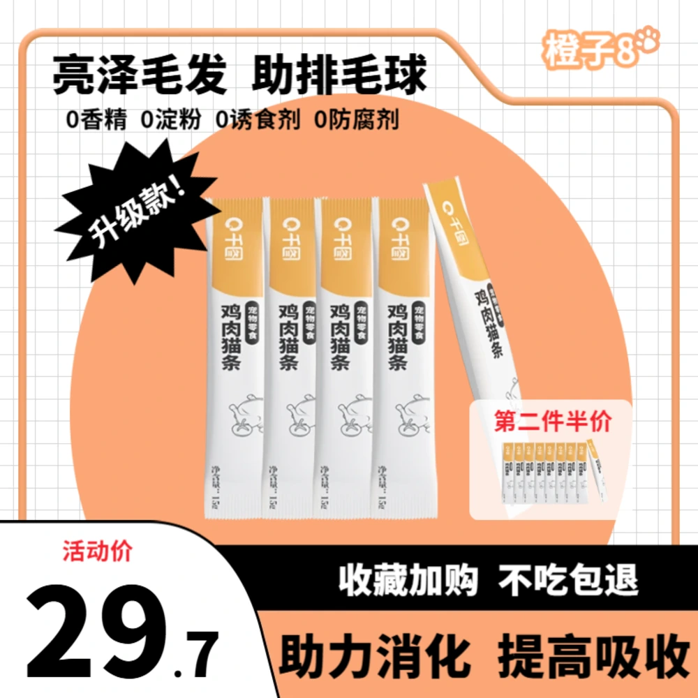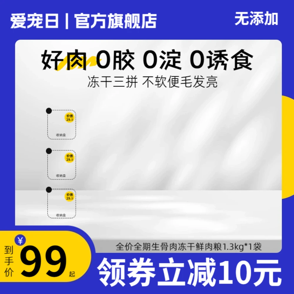 采用橙蓝高对比配色,突出健康卖点与“零添加”标签位,适用于宠物食品的促销展示。1:1主图规范适配各大平台,结构清晰、重点明确。支持灵活编辑价格、赠品与标签,提高信息可读性与用户信任,助力转化。