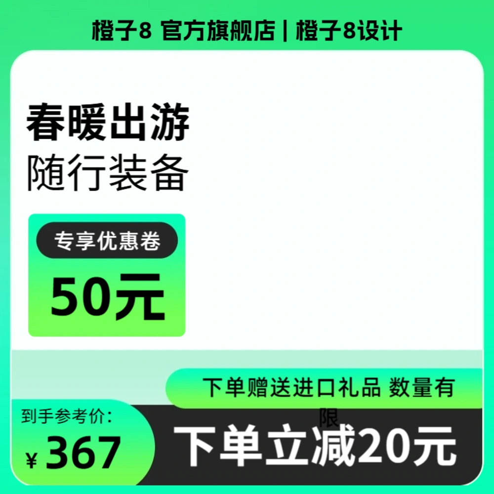 面向春上新节点的商品主图模板,青绿清新视觉强化季节感。1:1标准比例与规范占位适配淘宝、天猫、京东及Amazon、TikTok等平台。支持快速替换商品图与促销文案,适合旅游出行与户外用品的主图展示。
