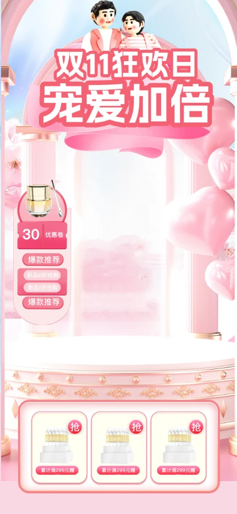 模板说明:少女心爆棚的粉色甜美双十一美妆直播背景模板,细节设计精致考究。粉嫩的色调不仅能衬托主播肤色,还非常适合彩妆教学或闺蜜局直播。推荐彩妆、护肤、美瞳等品类使用。在小红书、抖音等平台上,能精准吸引年轻女性用户,提升种草转化率。