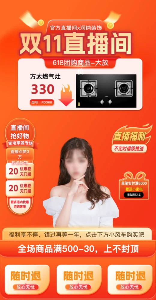 使用场景:双11大促直播、数码家电专场、限时秒杀