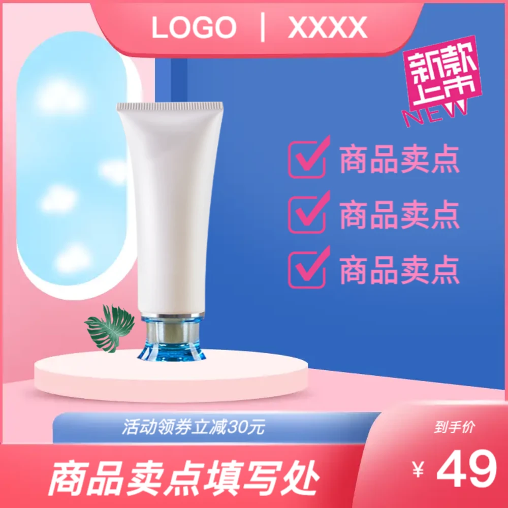 蓝白简洁风主图模板,1:1比例规范,重点突出价格与卖点信息。适用于淘宝、京东、小红书等平台的新品首发与促销活动。布局清爽、层级明确,便于用户快速理解商品亮点。支持文字与标签编辑,提升店铺专业度与点击表现。