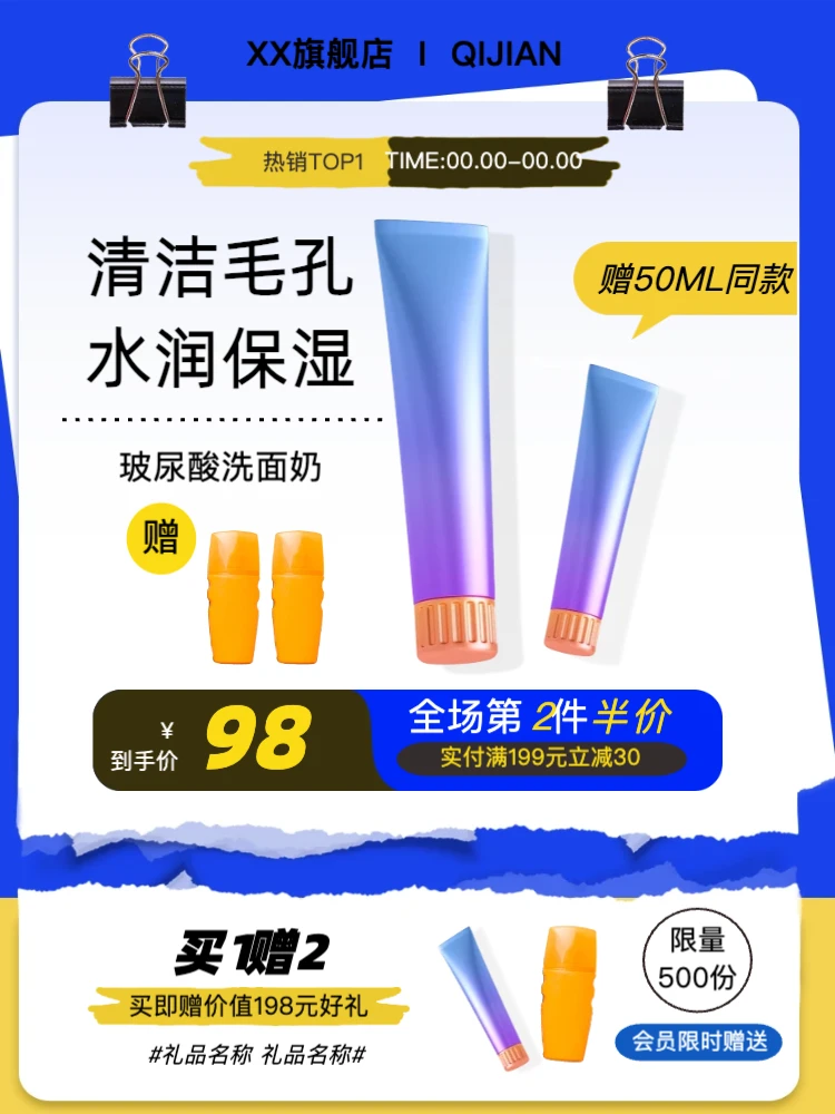 蓝白简洁风主图模板,1:1比例规范,重点突出价格与卖点信息。适用于淘宝、京东、小红书等平台的新品首发与促销活动。布局清爽、层级明确,便于用户快速理解商品亮点。支持文字与标签编辑,提升店铺专业度与点击表现。