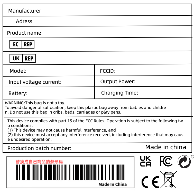 适用于Amazon等跨境平台的袋装普货警示标签,包含英、法、西三国语言。采用1:1规范排版,配有醒目的防窒息图标,符合多国合规要求。标签通用性强,适配各类袋装商品。建议粘贴于包装袋显著位置,并注意不要遮挡条形码,确保顺利入仓。