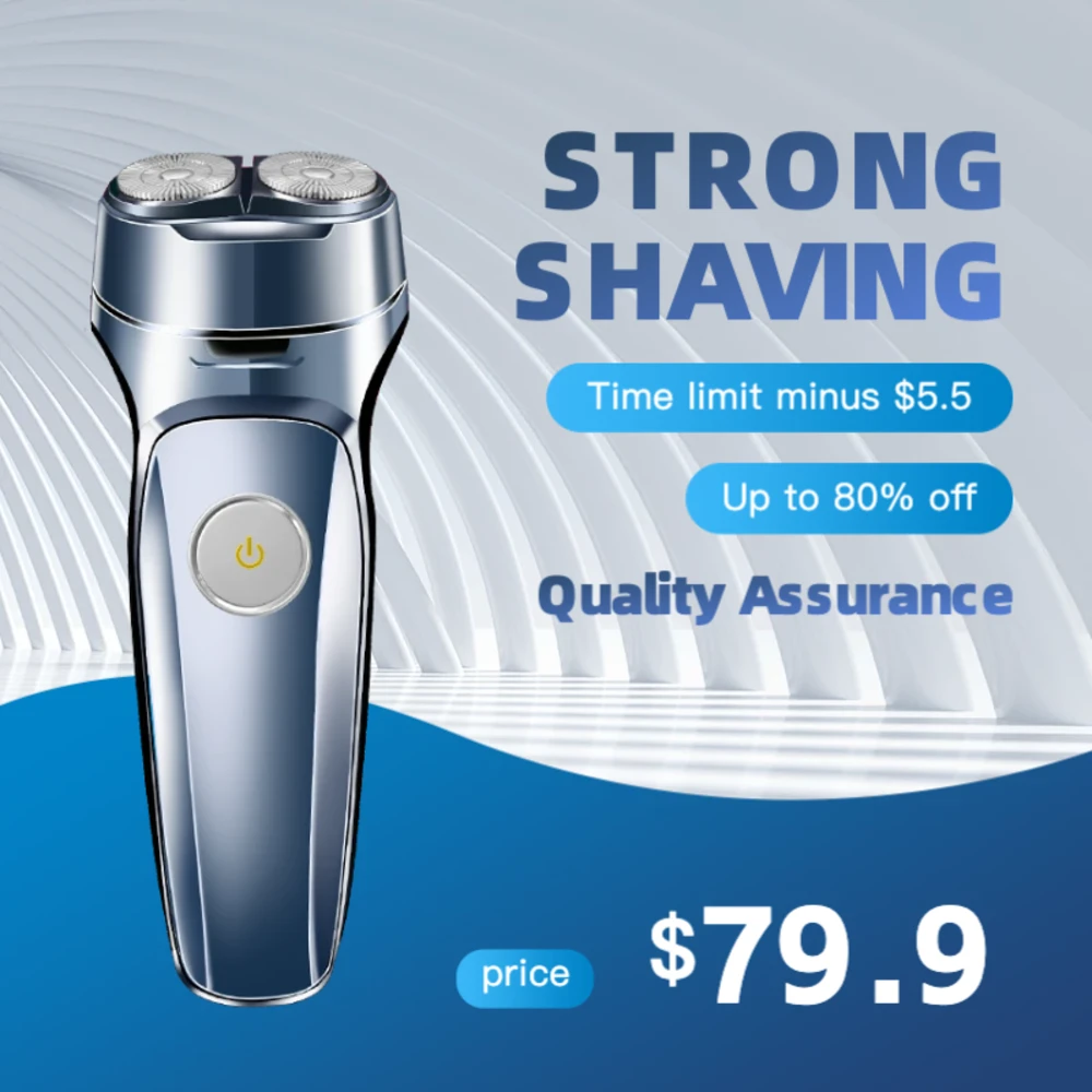 专为电动剃须刀设计的跨境电商主图模板,1:1比例。风格硬朗具备科技感,重点展示刀头结构与全身水洗等核心卖点。适配AliExpress、Amazon等平台。适合男士理容类电器,通过专业的细节展示建立信任,提升销量。