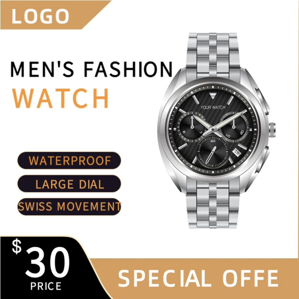 专为跨境手表品类设计的1:1主图,风格高端大气,彰显佩戴者品味。适用于Amazon、Shein等时尚平台。模板采用微距视角展示表盘与表带细节,规范构图符合平台要求。建议使用高清细节图并强调精湛工艺,吸引追求品质的消费者。