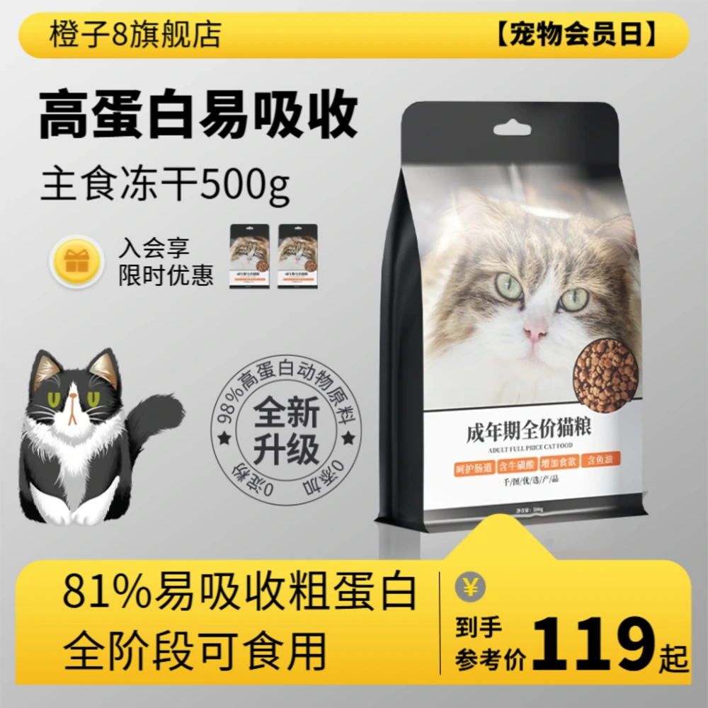 采用橙蓝高对比配色,突出健康卖点与“零添加”标签位,适用于宠物食品的促销展示。1:1主图规范适配各大平台,结构清晰、重点明确。支持灵活编辑价格、赠品与标签,提高信息可读性与用户信任,助力转化。