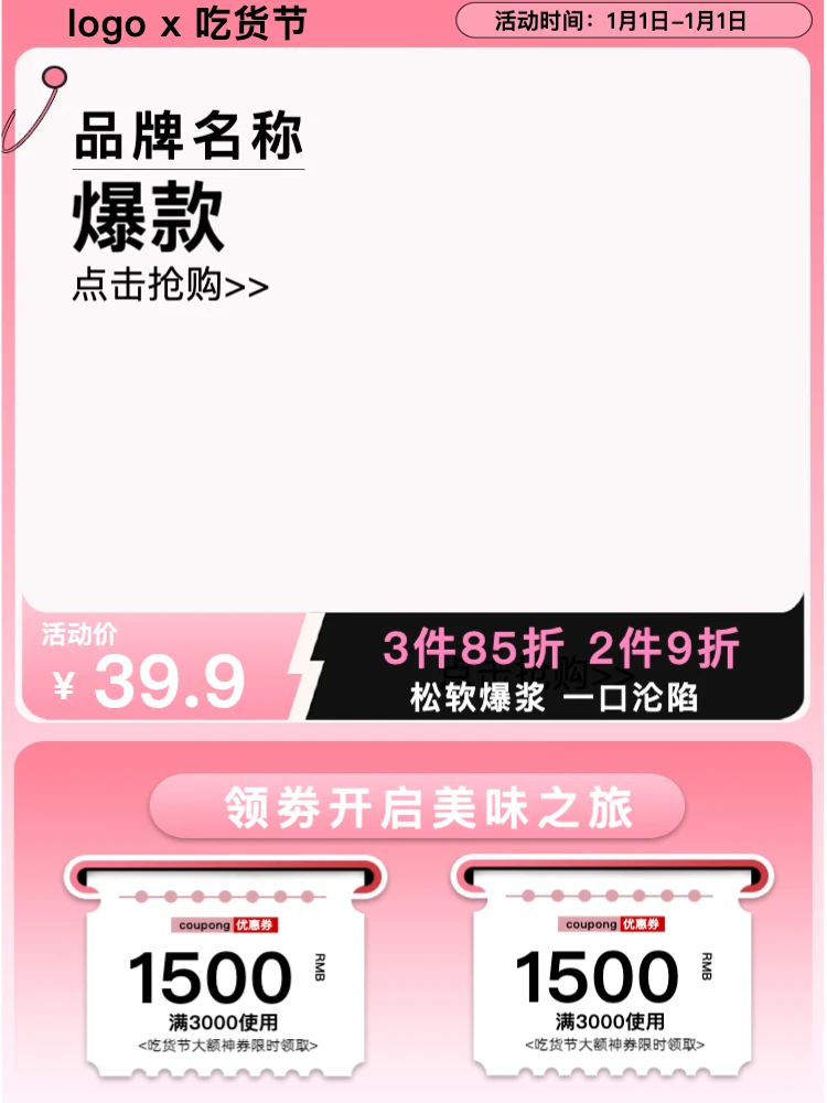 专为甜品烘焙行业设计的3:4竖版主图模板,采用粉嫩清新的配色,完美衬托美食的诱人色泽。适用于饿了么、美团外卖封面或小红书美食种草。规范的图文排版,既突出了产品主体,又清晰展示了口味或优惠信息。操作简单,一键替换图片。