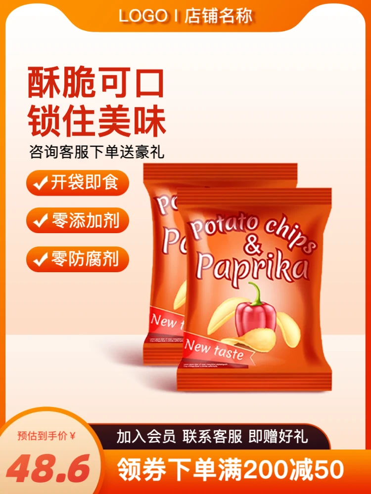 专为休闲零食设计的3:4竖版主图,采用暖色高对比配色,有效激发消费者食欲。适用于淘宝、拼多多等平台。模板重点突出产品包装与口味,卖点直观,非常适合零食囤货、吃货节及办公室下午茶场景。建议展示实物细节并强调价格优势,以吸引消费者下单。