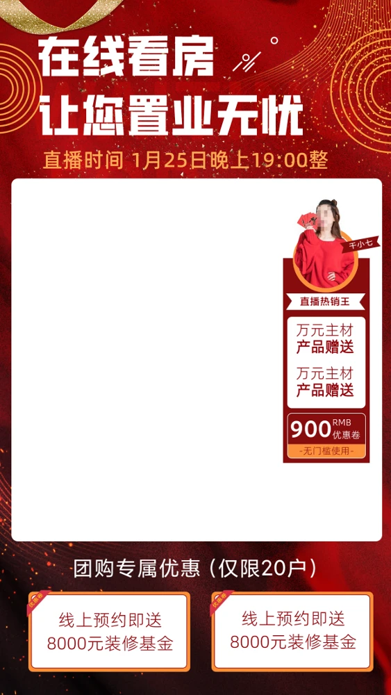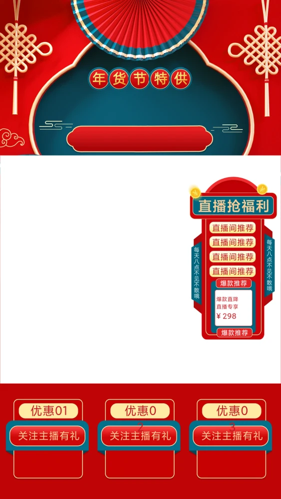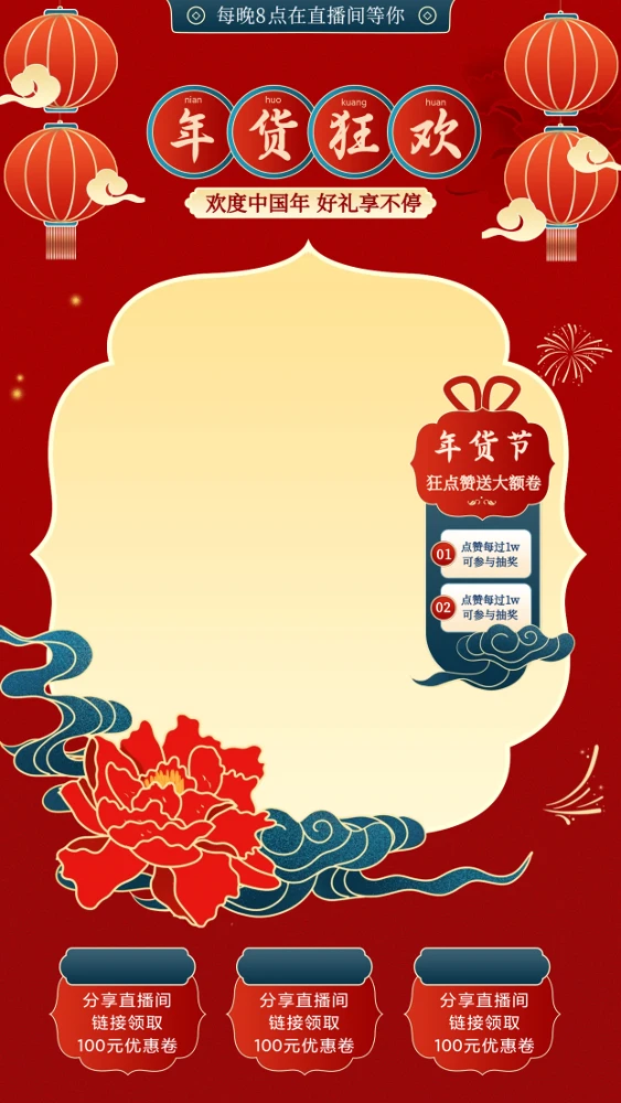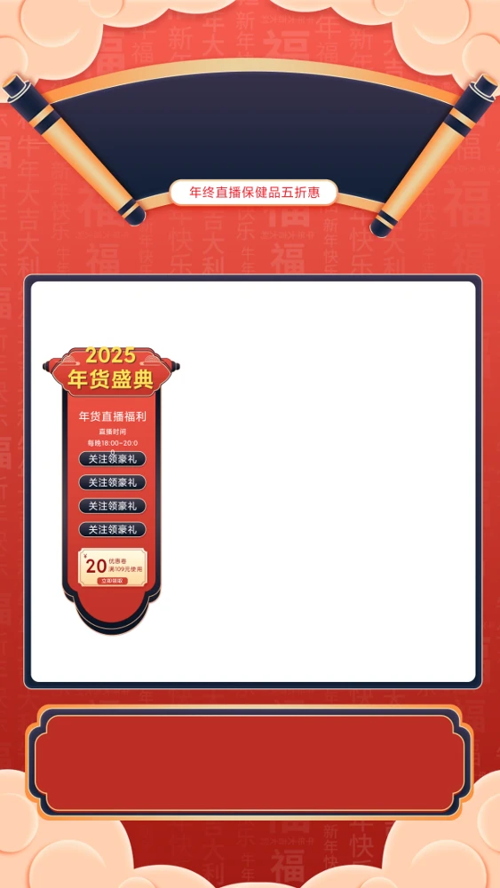 充满传统韵味的春节直播背景,融入了剪纸、祥云等经典元素。红色的主调象征着红红火火,非常适合特产、老字号等商家的年货直播。竖屏设计充分利用了手机屏幕空间,确保商品和优惠信息都能清晰呈现。这款电商活动模板能迅速拉近与观众的心理距离,唤起对传统节日的共鸣,从而促进下单转化。