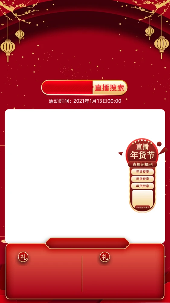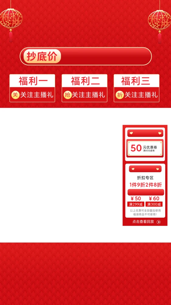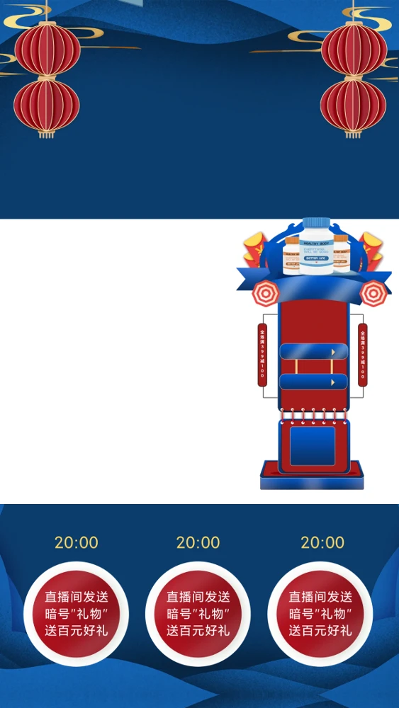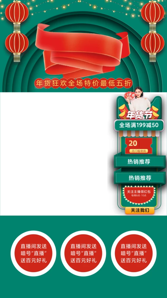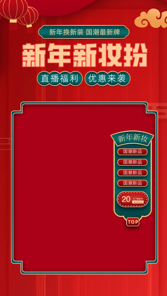 以高高挂起的红灯笼为视觉焦点的直播背景模板,寓意着团圆和喜庆。浓郁的节日氛围非常适合零食、酒水等聚会常备品的销售。竖屏设计优化了移动端观看体验,右侧或底部预留了福利发放区,方便主播进行抽奖或发券互动。这款店铺装修素材能有效留住划过的观众,提升直播间的人气和活跃度。
