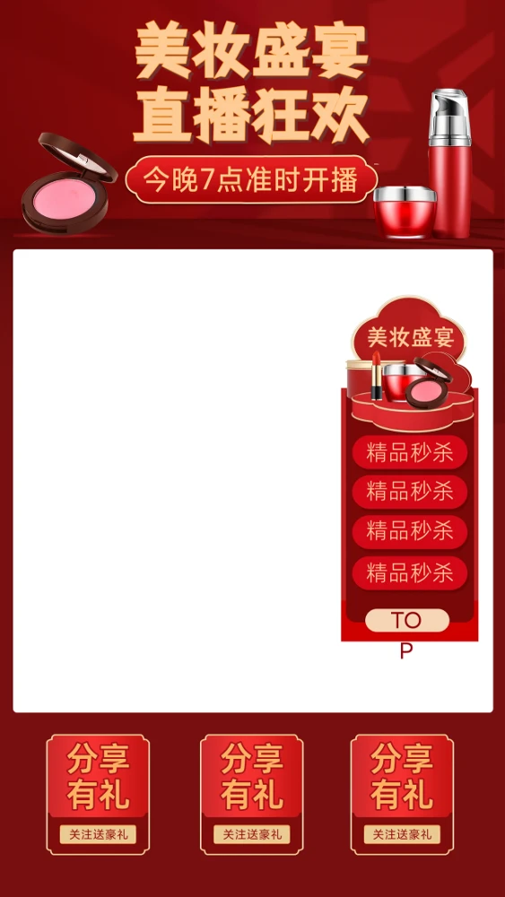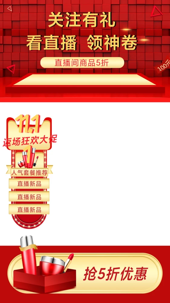 以金色为主调的奢华风直播背景,散发着高端大气的光泽感。红色的点缀恰到好处,既不失节日的喜庆,又保持了高级的格调。竖屏构图完美衬托珠宝、高端礼品等商品的贵气。预留的信息展示区设计简约,不喧宾夺主。这款高级感主图背景能有效筛选出高净值用户,提升直播间的客单价和品牌形象。
