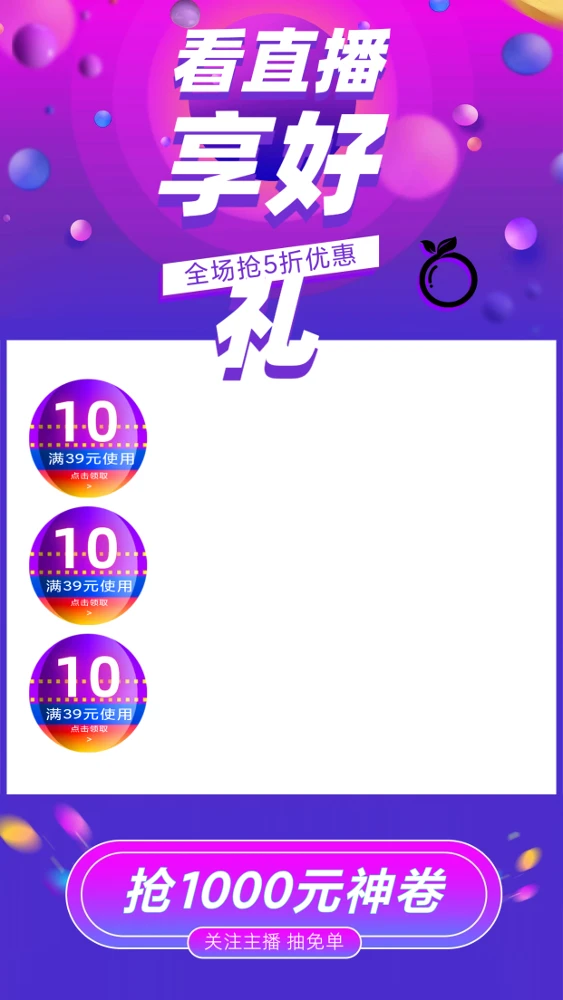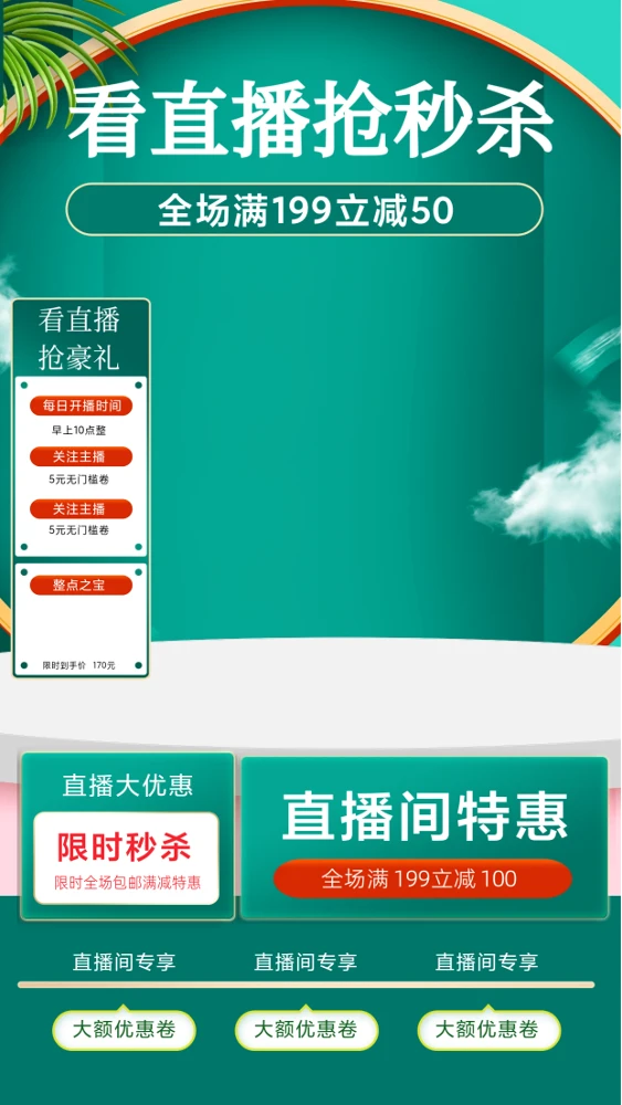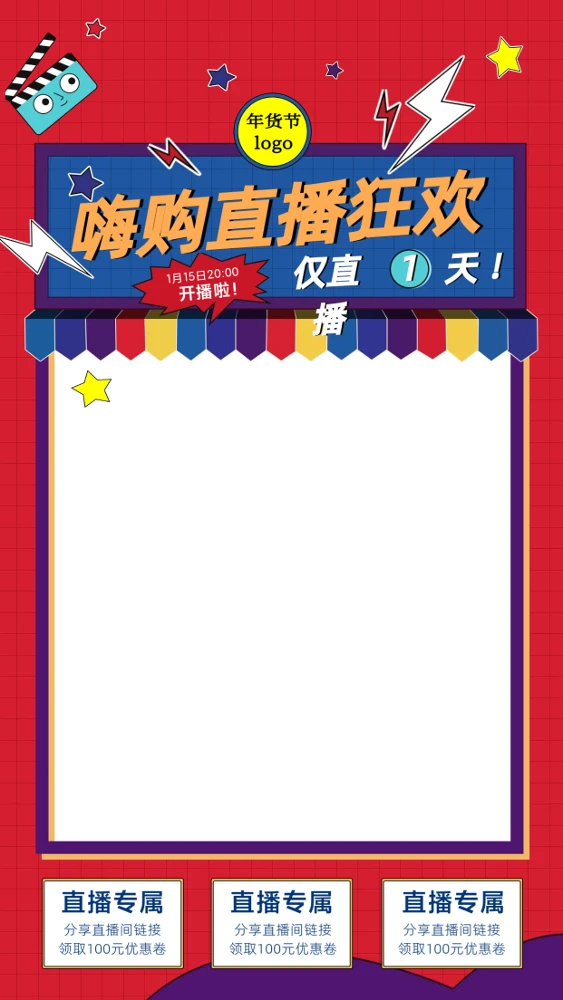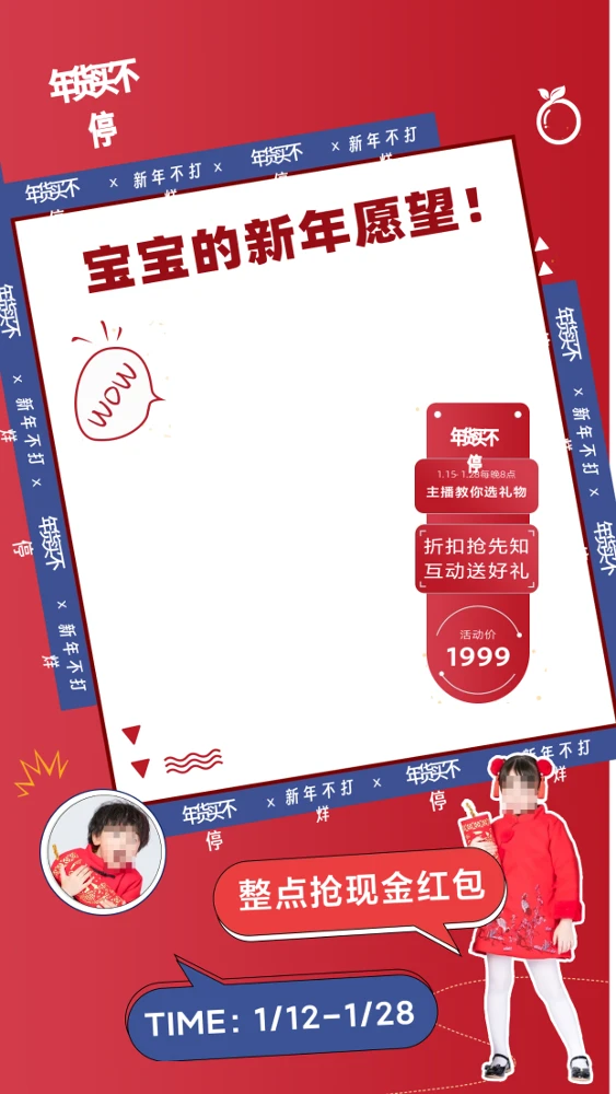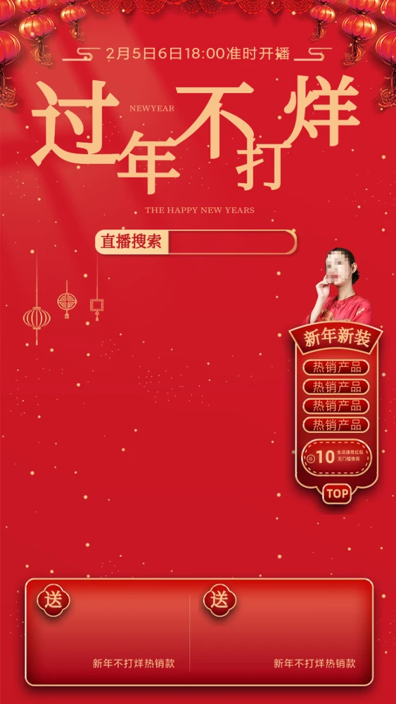 融入鞭炮、烟花等动态元素的直播背景模板(静态展示),营造出热闹非凡的过年景象。这种高能的视觉氛围非常容易感染观众,激发冲动消费。竖屏设计聚焦于画面中心,适合玩具、节庆用品等需要强互动的品类。背景中的信息区设计醒目,便于展示限时秒杀等紧迫感强的促销活动,强力助推转化率提升,是大促海报模板的优秀选择。