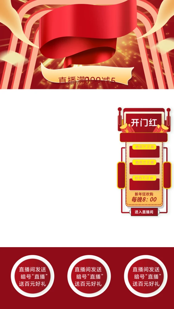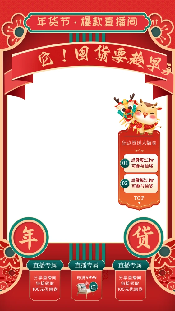 汇聚了丰富节庆元素的直播背景,如舞龙舞狮、灯笼鞭炮等,仿佛将春节庙会搬进了直播间。结构化的竖屏布局确保了在热闹的氛围中,促销信息依然清晰可见。适用于礼品、民俗工艺品等商家的节日特卖。这款背景能极大地提升直播间的吸睛能力,吸引大量自然流量进入,增加活动的曝光度和影响力。