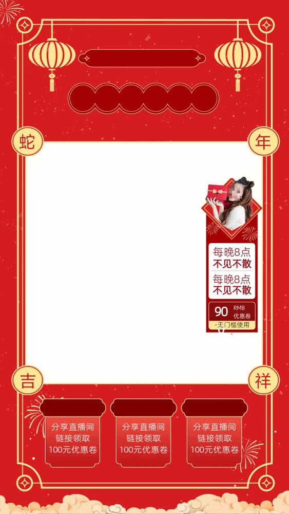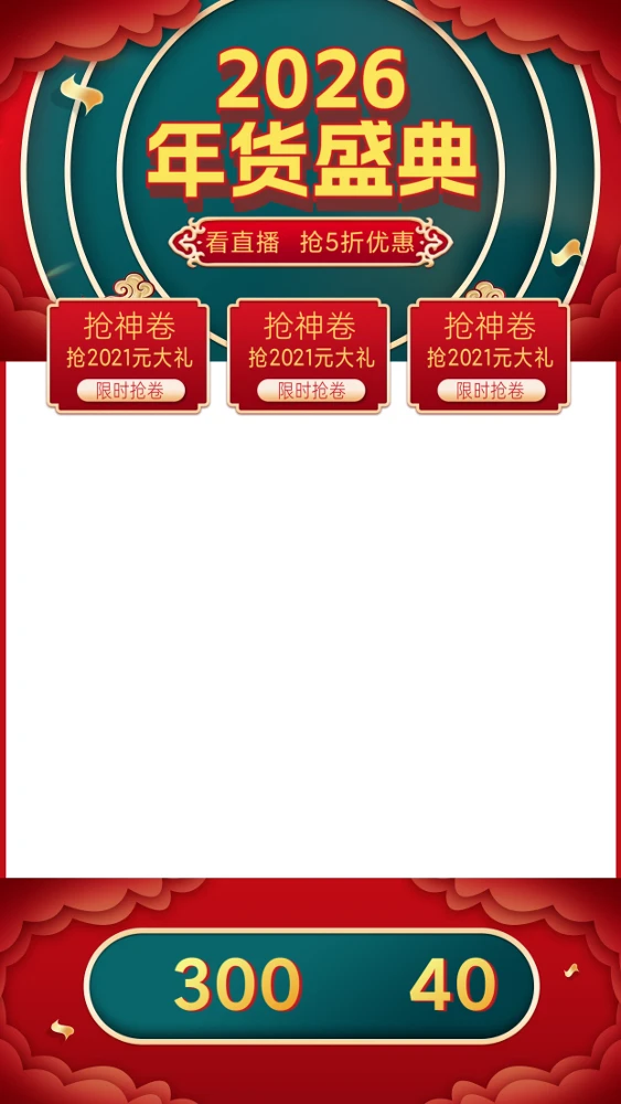 一款通用性极强的春节直播促销背景。红金色的主调既符合节日传统,又具备现代电商的促销感。竖屏设计规范大气,左右两侧预留了优惠券和活动规则的展示位。适用于服饰、美妆等各类商家在春节期间使用。清晰的信息布局有助于观众快速了解活动详情,减少沟通成本,提升直播间的留存和互动。