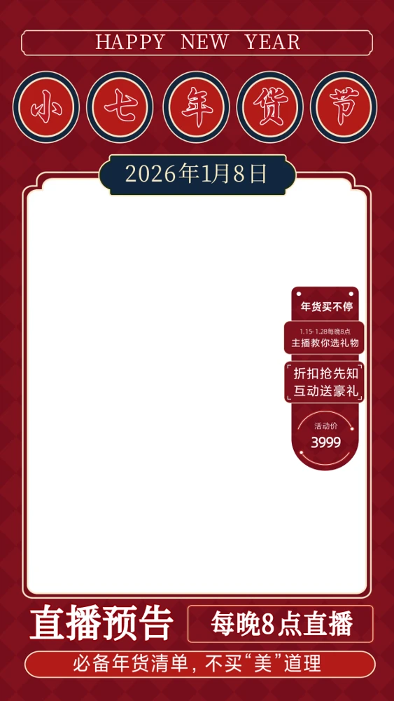 专为提升通用电商转化率而设计的春节年货节竖屏直播背景。融入了浓厚的节庆元素,契合年货节的热闹氛围。竖屏长图结构强化了信息的传达效率,特别支持突出价格优势与会员权益。适配直播封面与暂停画面,能有效抓住用户注意力,提升直播间的停留时长与下单转化率。是年货节期间商家必备的高效营销工具。