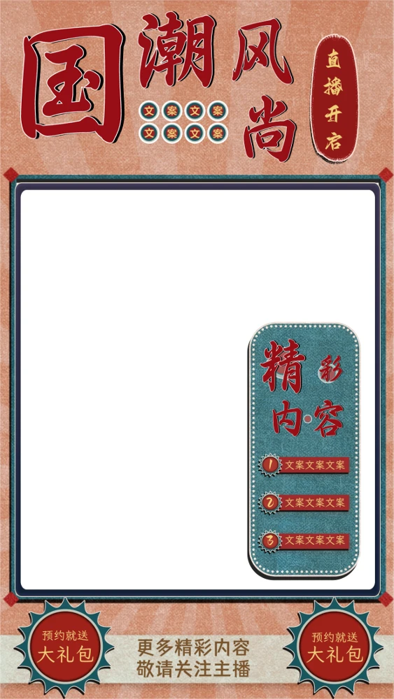 专为通用电商国潮主题直播设计的竖屏背景模板。采用经典的国潮元素与现代排版相结合,营造出时尚而复古的视觉效果。竖屏长图设计聚焦于主播与商品,简洁的布局便于清晰呈现优惠信息与产品卖点。无论是作为直播封面还是间隔画面,都能有效提升点击率与互动性。适用于服饰、文创等全品类商家的国潮营销活动。