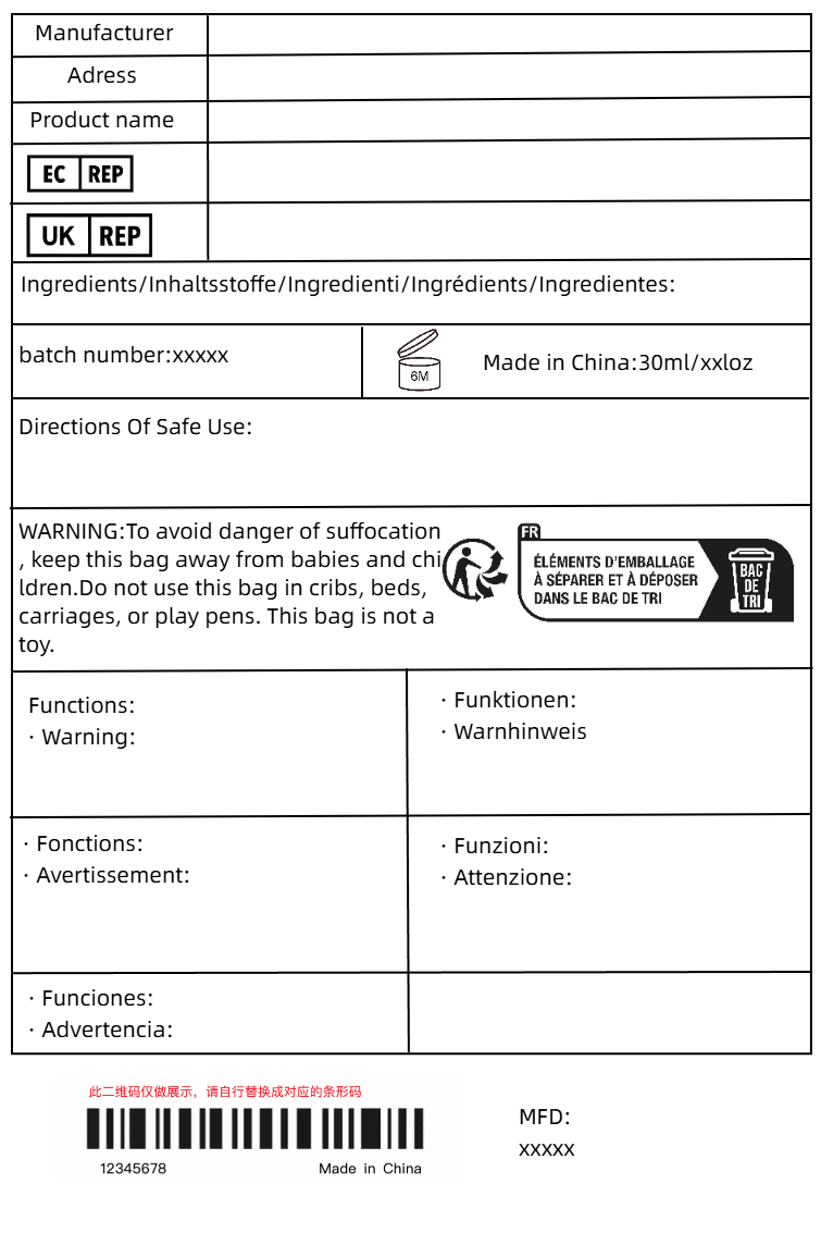 专为面向全球市场的跨境商品设计的袋装合规标签,涵盖多语种警示信息。1:1的标准尺寸适配大多数包装袋,字体清晰醒目,确保安全信息有效传达。适用于Amazon、Temu等全球化平台。使用前请确认目标市场的具体语言要求,并确保打印质量。